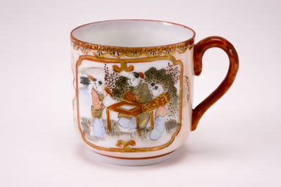 Wit kopje met oor en ijzerrode rand. Op de buitenzijde drie cartouches met daarin een landschapje met bloemen en vogel, drie personen aan een tafel en in de laatste 1 zittende persoon en twee staande personen in meerdere kleuren. (Nederlands)