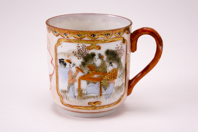 Wit kopje met oor en ijzerrode rand. Op de buitenzijde drie cartouches met daarin een landschapje met bloemen en vogel, drie personen aan een tafel en in de laatste 1 zittende persoon en twee staande personen in meerdere kleuren. (Nederlands)