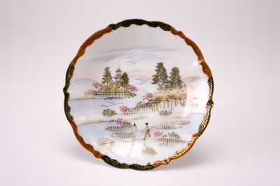 Wit schoteltje met geschulpte rand. Langs de rand een versiering in zwart,ijzerrood en goud. Op het plat een landschapdecor met bergen, huizen en twee personen, in zachte tinten. (Nederlands)