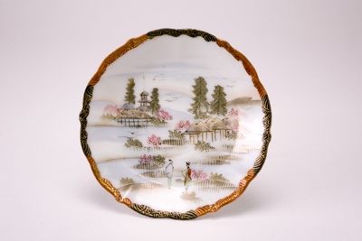 Wit schoteltje met geschulpte rand. Langs de rand een versiering in zwart,ijzerrood en goud. Op het plat een landschapdecor met bergen, huizen en twee personen, in zachte tinten. (Nederlands)