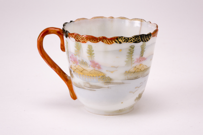 Wit kopje met oor en geschulpte rand. Langs de rand een versiering in zwart,ijzerrood en goud. Op de buitenzijde een landschapdecor met bergen, huizen en twee personen, in zachte tinten. (Nederlands)