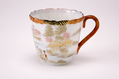 Wit kopje met oor en geschulpte rand. Langs de rand een versiering in zwart,ijzerrood en goud. Op de buitenzijde een landschapdecor met bergen, huizen en twee personen, in zachte tinten. (Nederlands)