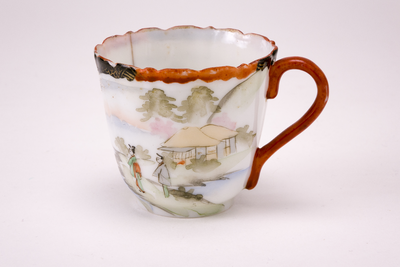 Wit kopje met oor en geschulpte rand. Langs de rand een versiering in zwart,ijzerrood en goud. Op de buitenzijde een landschapdecor met bergen, huizen en twee personen, in zachte tinten. (Nederlands)
