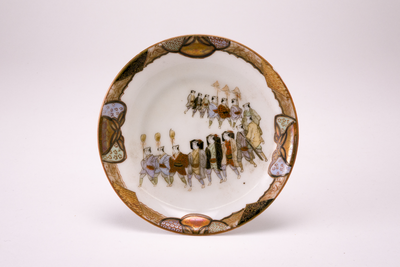 Wit dunwandig schoteltje met goudkleurige rand en op het plat een rij Japanse mannen.