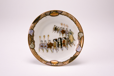 Wit dunwandig schoteltje met goudkleurige rand en op het plat een rij Japanse mannen.