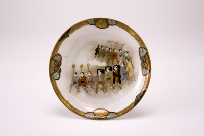 Wit dunwandig schoteltje met goudkleurige rand en op het plat een rij Japanse mannen, Van Diepencollectie, JMD-P-1961 |