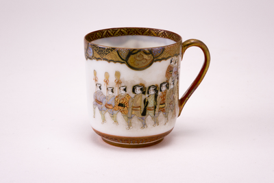 Wit dunwandig kopje met oor en goudkleurige rand en op de buitenzijde een rij Japanse mannen.