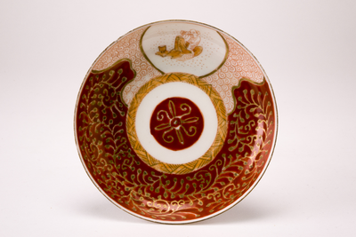 Klein wit schoteltje met op het plat decoraties in ijzerrood en goud. Hierin een uitsparing met daarin twee zittende personen.
