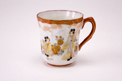 Wit Satsuma kopje met oor en gegolfde rand. Langs de rand een versiering in ijzerrood en goud. Op de buitenzijde een landschapdecor met bergen en twee personen, in zachte tinten. (Nederlands)