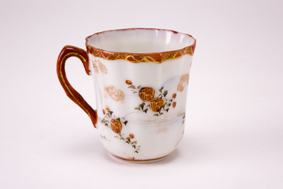Wit Satsuma kopje met oor en gegolfde rand. Langs de rand een versiering in ijzerrood en goud. Op de buitenzijde een landschapdecor met bergen en twee personen, in zachte tinten. (Nederlands)