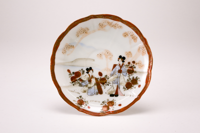 Wit Satsuma schoteltje met gegolfde rand. Langs de rand een versiering in ijzerrood en goud. Op het plat een landschapdecor met bergen en twee personen, in zachte tinten. (Nederlands)