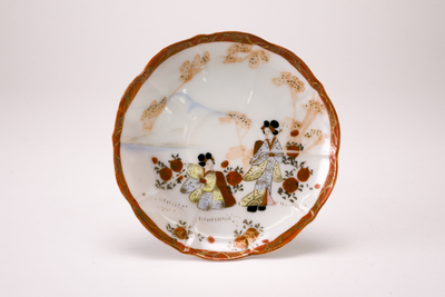 Wit Satsuma schoteltje met gegolfde rand. Langs de rand een versiering in ijzerrood en goud. Op het plat een landschapdecor met bergen en twee personen, in zachte tinten. (Nederlands)