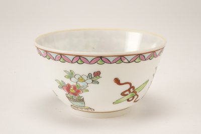 Wit kommetje zonder oor meerkleurige decoraties met bloemenvazen op tafeltjes, Van Diepencollectie, JMD-P-1978