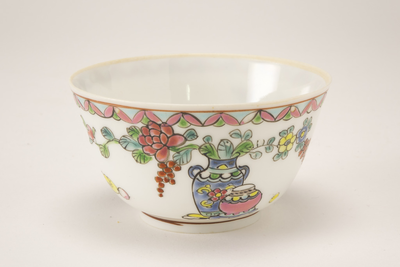 Wit kommetje zonder oor meerkleurige decoraties met bloemenvazen op tafeltjes, Van Diepencollectie, JMD-P-1979 |