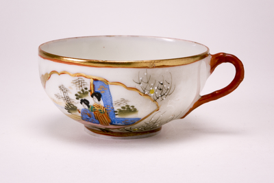 Witte kop met oor met langs de rand een sierlijn in ijzerrood en goud. Op de buitenzijde een cartouche met hierin een landschapje met twee vrouwen in kimono. (Nederlands)