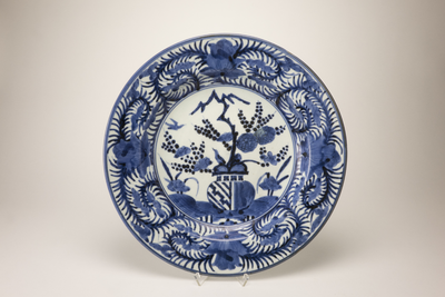 Dish on footring, wide, slightly upturned flat rim. On the base four spur-marks. Decorated in underglaze blue with flower sprays in a spherical flowerpot and a bare branch. This has been placed in a sketchily painted landscape with rocks near a lake. The flowerpot is reflected in the water. On the sides and rim powerful, spiralling scrolls and lotus flowers. The reverse is undecorated. (Engels)