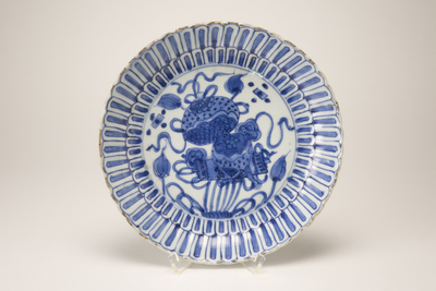 Dish on footring, spreading sides, lobed rim. Kraak porcelain, decorated in underglaze blue. In the centre a scroll, a double-gourd and flywhisks with ribbons. The sides with two rows of small lotus-petal shaped panels, each divided by a powerful vertical line. (Engels)
