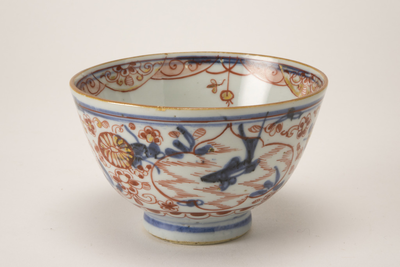 Witte kom op standring met op de binnen- en buitenzijde bloemdecoraties in ijzerrood en goud. Hieronder blauwe decoraties met o.a. vissen.