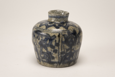 Klein grijsbruin gecraqueleerd potje met donkerblauw onderglazuur met rond de hals bloemblaadjes en rondom op de buitenzijde drie hertjes.