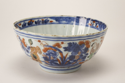 Geribde kom op standring met op de binnen- en buitenzijde blauwe bloemdecoraties. hieroverheen aanvullende bloemdecoraties met zotjes,leeuwen en vogeltjes in de kleurenijzerrood, groen en goud. (Nederlands)
