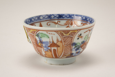 Amsterdams bont kom op standring. Op de bodem een hengselmand. Langs de binnenrand een ijzerrode guirlandeversiering aan een blauwe band. Aan de buitenrand en onderzijde een blauwe band. Hiertussen vier uitsparingen met hierin een hengselmand en in de twee anderen een landschapje. (Nederlands)