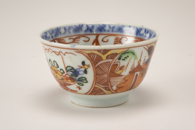 Amsterdams bont kom op standring. Op de bodem een hengselmand. Langs de binnenrand een ijzerrode guirlandeversiering aan een blauwe band. Aan de buitenrand en onderzijde een blauwe band. Hiertussen vier uitsparingen met hierin een hengselmand en in de twee anderen een landschapje. (Nederlands)