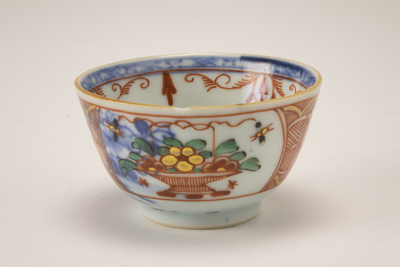 Amsterdams bont kom op standring. Op de bodem een hengselmand. Langs de binnenrand een ijzerrode guirlandeversiering aan een blauwe band. Aan de buitenrand en onderzijde een blauwe band. Hiertussen vier uitsparingen met hierin een hengselmand en in de twee anderen een landschapje. (Nederlands)