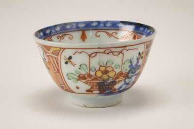 Amsterdams bont kom op standring. Op de bodem een hengselmand. Langs de binnenrand een ijzerrode guirlandeversiering aan een blauwe band. Aan de buitenrand en onderzijde een blauwe band. Hiertussen vier uitsparingen met hierin een hengselmand en in de twee anderen een landschapje. (Nederlands)