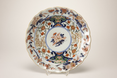 Wit diep Imari bord met dikke scherf en gelobde golvende rand. Op de rand en op het plat meerkleurige bloemdecors en twee Fo-honden in ijzerrood, goud en groen en onderglazuur blauw. (Nederlands)