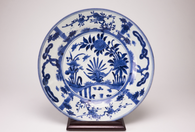 Dish on footring, wide, slightly upturned flat rim. On the base three spur-marks. An underglaze-blue decoration of a bird standing at the edge of an expanse of water with tail-feathers displayed; large flowering plants on either side. On the sides and rim a continuous pattern of a rocky ground with flowering prunus alternating with a pine tree separated by sections of bamboo. The reverse is undecorated. (Engels)