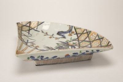 Fan-shaped dish on a high, triangular foot. Lobbed edge. Imari, painted in underglaze blue, green iron-red and gold, the decoration fitting the shape. In the middle a prunus tree, bamboo and a flowering shrub, on the sides latticework, the polygonal openings filled with cherry blossoms. On the reverse peony sprays, the foot with a comb pattern. The lower point with the spreading ends of the fan-sticks has broken of. (Engels)