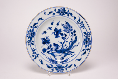 Plat wit bord met op de lip een bruine lijn. Op het plat een blauw bloemdecor met diverse vogels.(kraanvogels en een phoenix op een rots). Op de rand blauwe bloemdecoraties. (Nederlands)