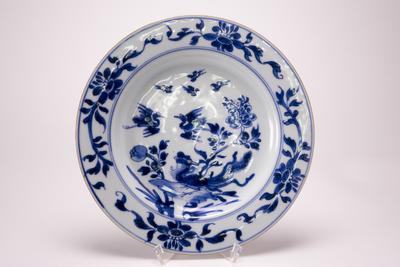 Plat wit bord met op de lip een bruine lijn. Op het plat een blauw bloemdecor met diverse vogels.(kraanvogels en een phoenix op een rots). Op de rand blauwe bloemdecoraties. (Nederlands)