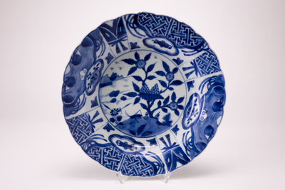 Diep wit bord met op het plat een landschapdecor met bloeiende takken en een krekel. Op de gegolfde rand blauwe decoraties verdeeld over acht velden. (Nederlands)