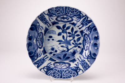 Diep wit bord met op het plat een landschapdecor met bloeiende takken en een krekel. Op de gegolfde rand blauwe decoraties verdeeld over acht velden.