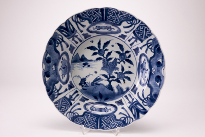 Diep wit bord met op het plat een landschapdecor met bloeiende takken en een krekel. Op de gegolfde rand blauwe decoraties verdeeld over acht velden. (Nederlands)