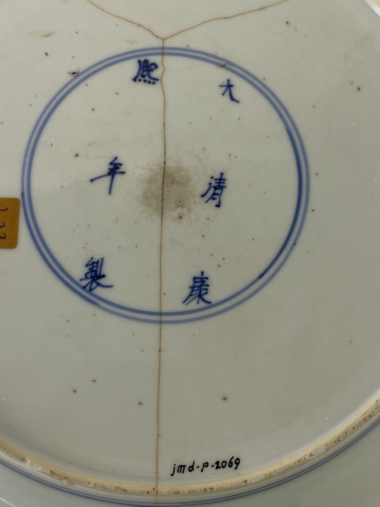 Groot diep wit bord met gegolfde rand. Op het plat drie lijzen, waarvan 1 te paard. In de lucht vliegen vogels. Op de rand acht vlakken met daarin om en om twee lijzen en twee bloemen in blauw. K`ang Hsi||JMD-P-2069||Azië||Onbekend||JMD-P-2069