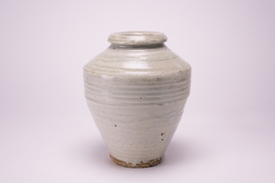 Grijs groene Celadon (?) stokkruik. met smalle hals. (Nederlands)