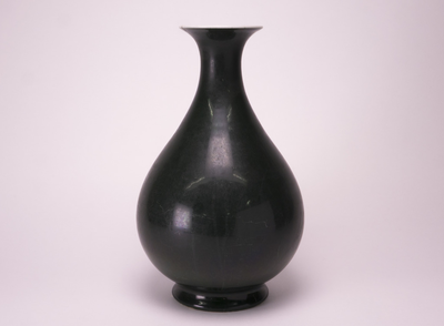 Grote balustervormige vaas met uitlopende hlas. De buitenzijde heeft een egaal donkergroen, enigszins mat glazuur. (Nederlands)