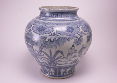 Large jar on footring, wide mouth, spreading foot. Decorated in underglaze blue with a continuous landscape with three horsemen, two figures near a pavilion and a large banana plant. Around the foot a band with stylised lotus-petal panels, around the shoulder a band with lambrequins, filled with a flower and scrolls. Around the mouthrim a meandering border. The base is unglazed. (Engels)