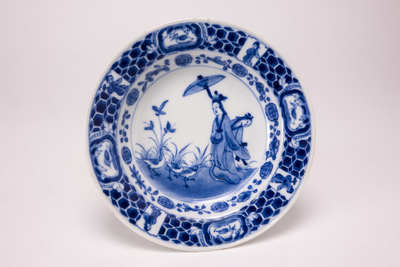 Small, deep saucer on footring, flat rim. Decorated in underglaze blue with a simplified representation of the ‘Parasol Lady’ (see cat. 98). On the rim a honeycomb motif, separated by eight panels with a paddling bird alternating with a lady with a parasol. On the reverse seven insects. (Engels)