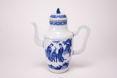 Hoog bergblauw gedecoreerd wit theekannetje met deksel en fraai gebogen vierkant oor en tuit. De knop van het deksel is in de vorm van een Fo-hond. Op de voor en achterzijde een lijzendecor. Vroeg K`ang Hsi. (Nederlands)