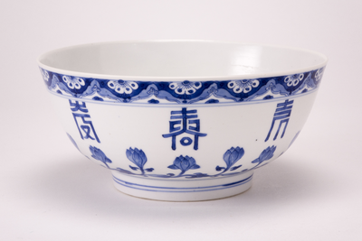 Bowl on footing, spreading sides. Covered with a slightly matt glaze. Decorated in underglaze blue with eight stylised characters. Around the mouthrim a band with half-flower rosettes, around the foot lotus flowers linked by scrolls. The inside is undecorated. On the base the six-character mark Chenghua in a double circle. (Engels)