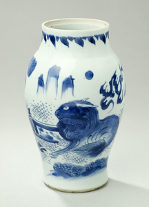 Balustervormige pot op voetring, wijde mond. Overgangsporselein, versierd in onderglazuur blauw met een doorlopend landschap met een fabeldier bij een hek en een bananenboom. Op de mondrand halve-blad motieven. Het deksel ontbreekt. (Nederlands)