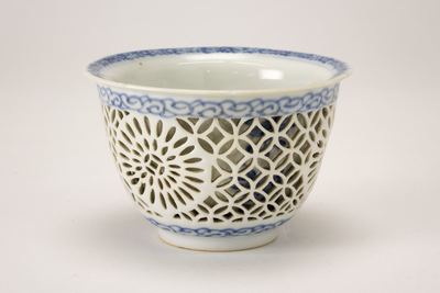 Theekop en schotel op voetring, spreidende mondrand/kant. De kop is dubbelwandig en opengewerkt met een patroon van gekoppelde cash (munt) motieven en twee grote chrysanten; de wand van de schotel is eveneens opengewerkt met een soortgelijk patroon en halve chrysanten. Versierd in onderglazuur blauw. Buiten rond de mondrand van de kop een spiraalband, binnenin rond de mondrand en op de rand van de schotel een band met een ruitpatroon. Op het plat van de schotel een centraal bloemmotief met daar rondom drie maal een pot met een bloeiende plant. Op de onderkant een rechthoekig huismerk. (Nederlands)