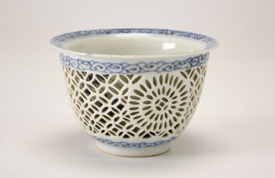 Theekop en schotel op voetring, spreidende mondrand/kant. De kop is dubbelwandig en opengewerkt met een patroon van gekoppelde cash (munt) motieven en twee grote chrysanten; de wand van de schotel is eveneens opengewerkt met een soortgelijk patroon en halve chrysanten. Versierd in onderglazuur blauw. Buiten rond de mondrand van de kop een spiraalband, binnenin rond de mondrand en op de rand van de schotel een band met een ruitpatroon. Op het plat van de schotel een centraal bloemmotief met daar rondom drie maal een pot met een bloeiende plant. Op de onderkant een rechthoekig huismerk. (Nederlands)