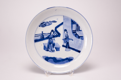 Wit bordje met op het plat een donkerblauw decor een hoek van een huis met twee lijzen en een zotje op een terras. Op de lip een dunne blauwe lijn.