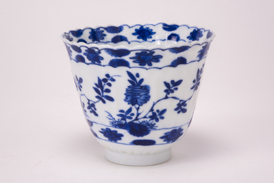 Witte gelobde kop met gegolfde bovenrand. Op de binnen- en buitenzijde een blauw bloemen- en rankendecor. (Nederlands)