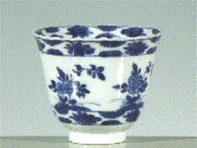 Witte gelobde kop met gegolfde bovenrand. Op de binnen- en buitenzijde een blauw bloemen- en rankendecor. (Nederlands)