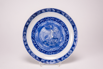 Wit bordje met op het plat in een donkerblauwe krans een zittende kraanvogel, Van Diepencollectie, JMD-P-2231 |